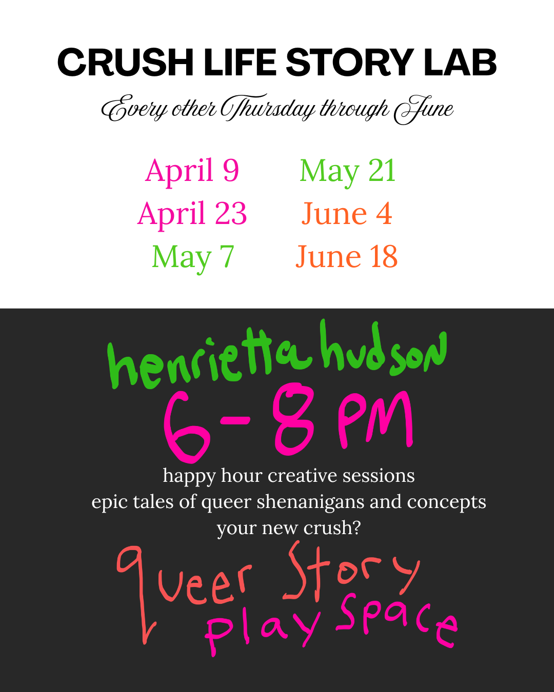 Every other Thursday through June, Danielle will be at Henrietta Hudson running the Crush Life Story Lab.